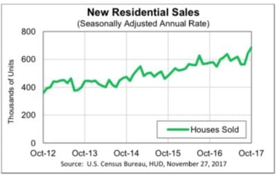 According to just released Census figures in its October 2017 New Residential Sales report, new single-family home sales are up 6.2 percent month-over-month. The Census Bureau’s numbers declared an average home sales price of $400,200 – the highest since March 2007’s average of $329,400.