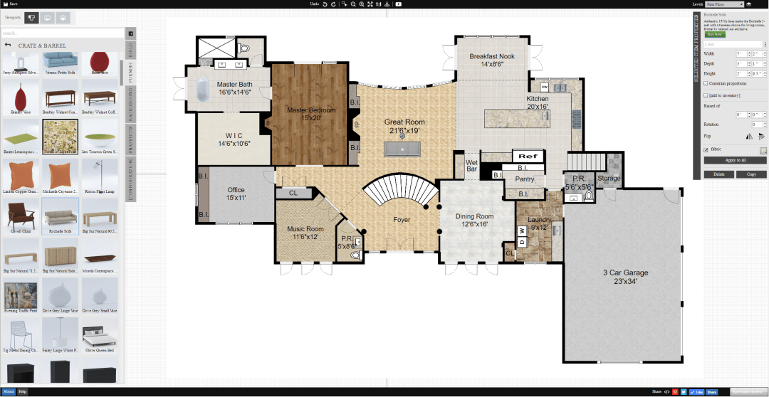 The new 3D space planner will allow editing in 3D mode, including dragging and dropping furniture, changing flooring or wall colors and more. I also has a roof tool so you can visualize different roofing patterns or even see the whole house in a stacked 3D view. NO other online tool has this robust functionality tied to an actual house's floor plan created on the listing side of the transaction.